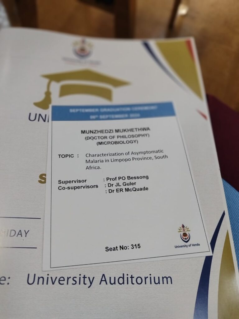 “I’m grateful to the most high God to have finally reached this stage in my academic career. My PhD in Microbiology focused on asymptomatic malaria in Limpopo Province, South Africa and I was opportuned to conduct part of my research in my home village, Ha-Lambani. I was overjoyed as this opportunity allowed me to give back to my community, embodying the belief that “charity begins at home”. Part of my work can be accessed through the link: https://doi.org/10.1186/s12936-021-03724-z”